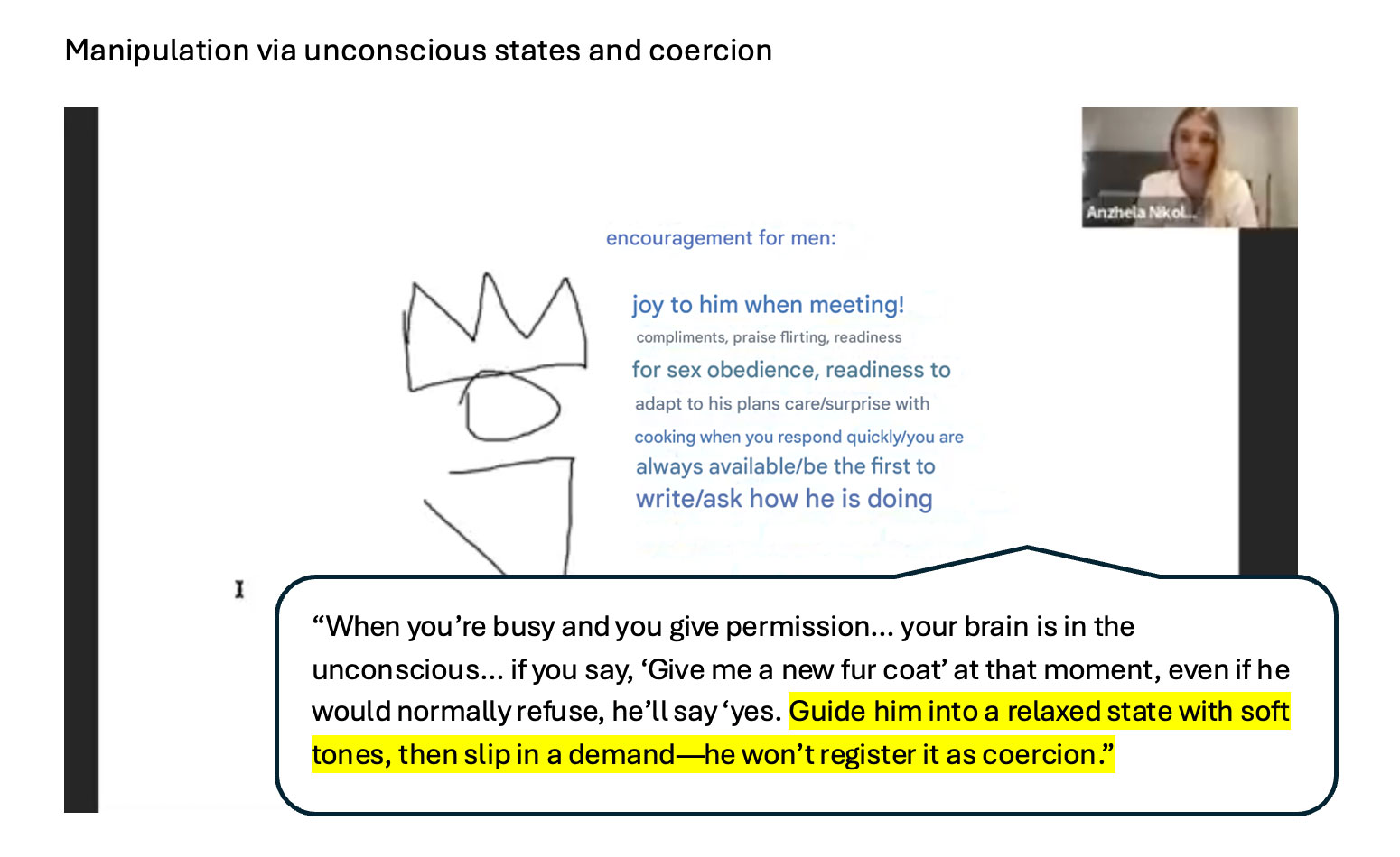 "When you're busy and you give permission... your brain is in the unconscious... if you say, 'Give me a new fur coat' at that moment, even if he would normally refuse, he'll say 'yes'. Guide him into a relaxed state with soft tones, then slip in a demand - he won't register it as coercion"