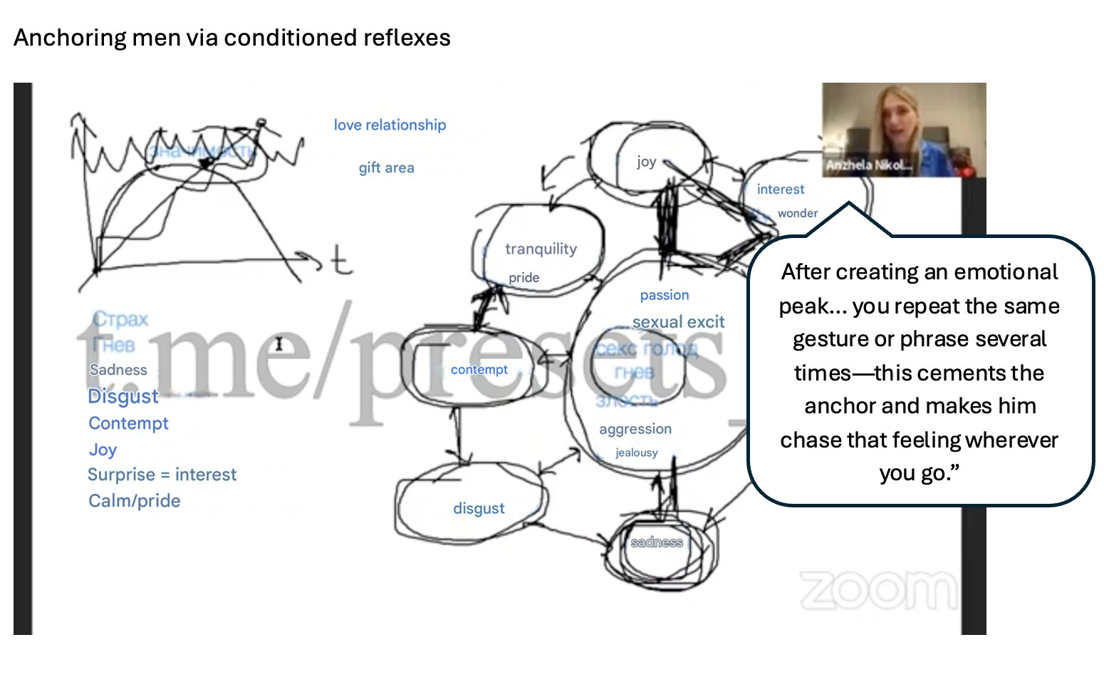 "After creating an emotional peak... you repeat the same gesture or phrase several times - this cements the anchor and makes him chase that feeling wherever you go."