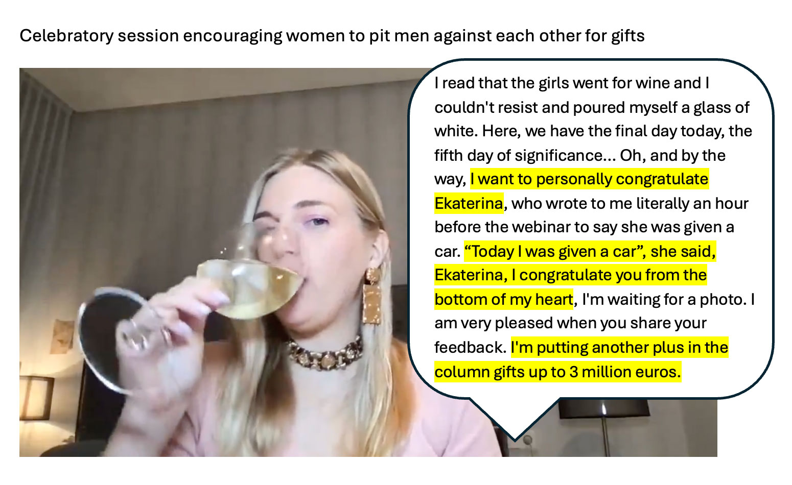 "I read that girls went for wine and I couldn't resist and poured myself a glass of white. Here, we have the final day today, the fifth day of significance... Oh, and by the way, I want to personally congratulate Ekaterina, who wrote to me literally an hour before the webinar to say she was given a car. "Today I was given a car", she said, Ekaterina, I congratulate you from the bottom of my heart, I'm waiting for a photo. I am very please when you share your feedback. I'm putting another plus in the column gifts up to 3 million euros."