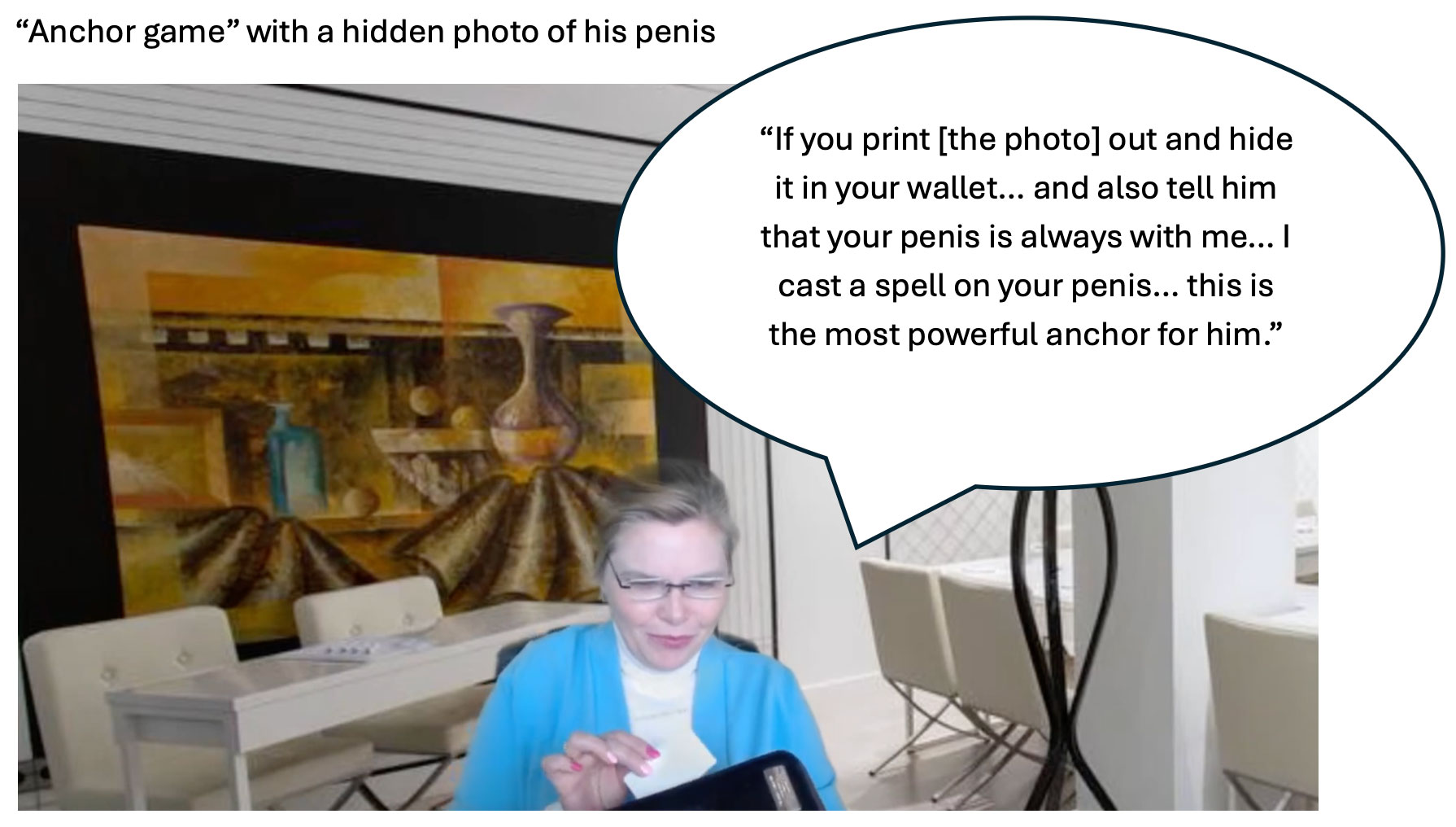 "If you print [the photo] out and hide it in your wallet... and also tell him that your penis is always with me... I cast a spell on your penis... this is the most powerful anchor for him."