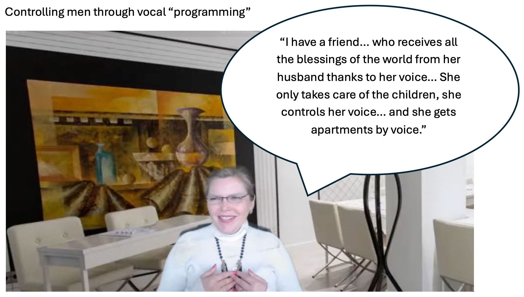 "I have a friend... who receives all the blessings of the world from her husband thanks to her voice... She only takes care of the children, she controls her voice... and she gets apartments by voice"