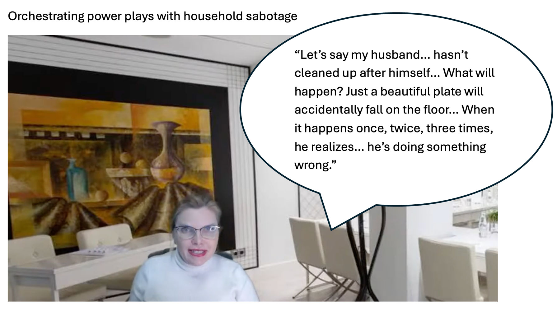 "Let's say my husband... hasn't cleaned up after himself... What will happen? Just a beautiful plate with accidentally fall on the floor... When it happens once, twice, three times, he realizes... he's doing something wrong."